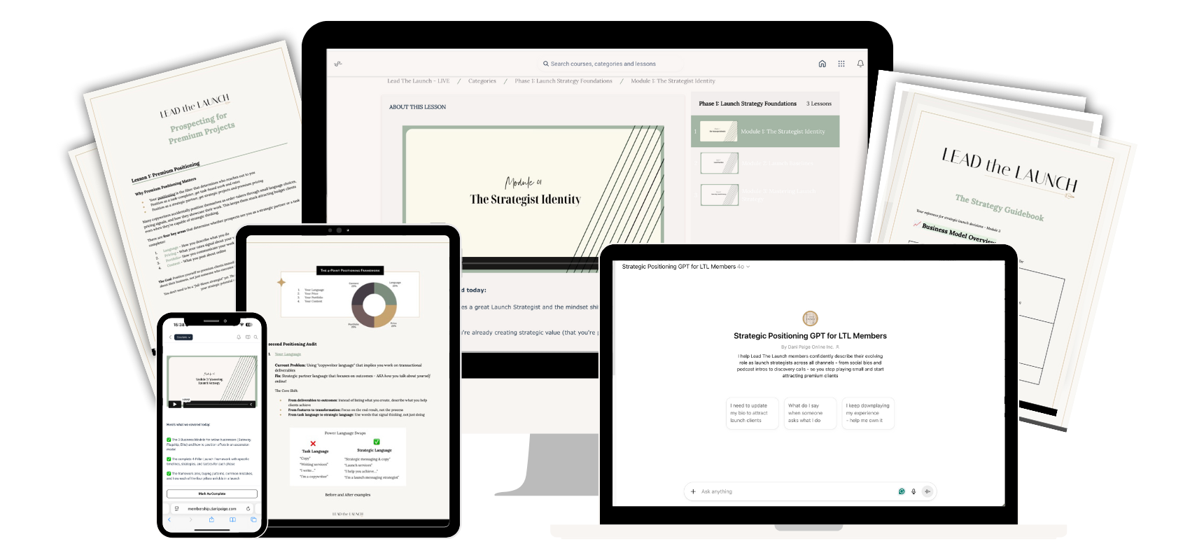 The step-by-step system to become the $7K-$15K per project Launch Strategist your clients can't replace—with the confidence, tools, and hand-holding practice so you stop shrinking back and start stepping up (even if you've never led a launch before)