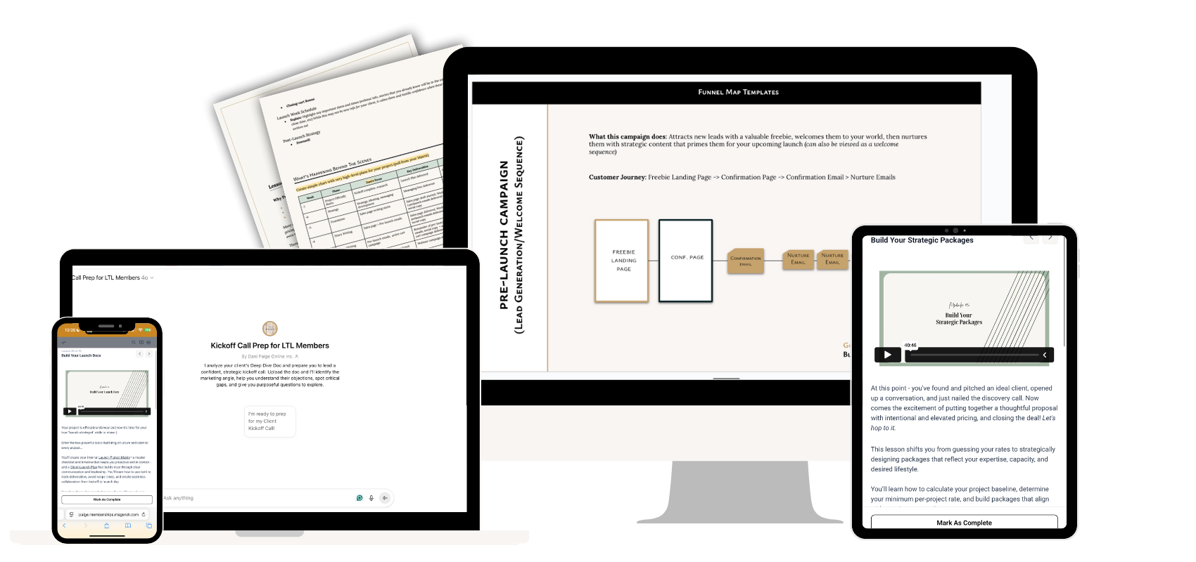 Implementation items: The Strategic Pricing Suite - Swipe-and-deploy pricing calculator, packaging templates, proposal GPTs, and visual funnel map templates that help you confidently quote premium rates (and have clients say yes because they can SEE the value)